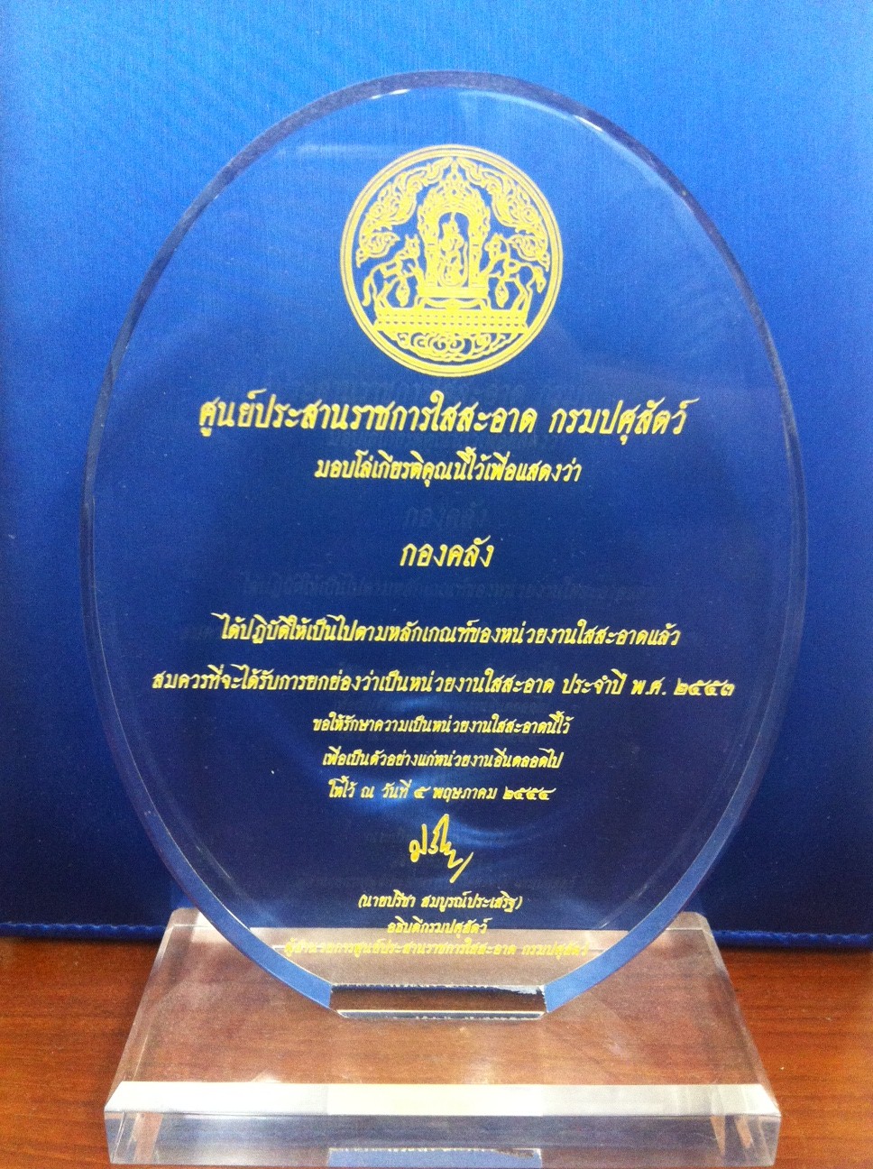 ศูนย์ประสานราชการใสสะอาด กรมปศุสัตว์ มอบโล่เกียรติคุณนี้ไว้เพื่อแสดง ว่า กองคลัง