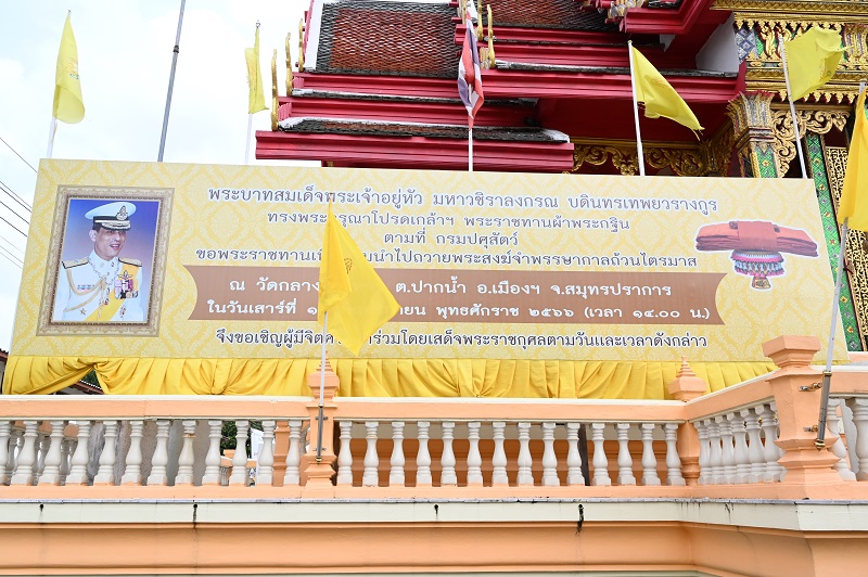 พระบาทสมเด็จพระปรเมนทรรามาธิบดีศรีสินทรมหาวชิราลงกรณ พระวชิรเกล้าเจ้าอยู่หัว ทรงพระกรุณาโปรดเกล้าโปรดกระหม่อม พระราชทานผ้าพระกฐินให้กรมปศุสัตว์ ตามที่ขอพระราชทาน เพื่อน้อมนําไปถวายพระสงฆ์จำพรรษากาล ถ้วนไตรมาส ณ วัดกลางวรวิหาร ตำบลปากน้ำ อำเภอเมืองสมุทรปราการ จังหวัดสมุทรปราการ ในวันเสาร์ที่ 11 พฤศจิกายน 2566 โดยมีนายสัตวแพทย์สมชวน รัตนมังคลานนท์ อธิบดีกรมปศุสัตว์ เป็นประธานในพิธี พร้อมด้วยคณะผู้บริหาร เจ้าหน้าที่กรมปศุสัตว์ หัวหน้าส่วนราชการ และประชาชนในพื้นที่เข้าร่วม ทั้งนี้ ยอดถวายผ้าพระกฐินพระราชทาน เป็นจำนวนทั้งสิ้น 3,282,576.30 บาท